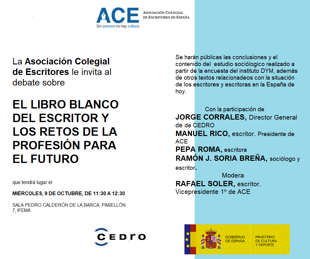 El próximo miércoles, ACE participará en dos mesas redondas en la Feria LIBER 2019, en el recinto ferial de IFEMA. Abajo se reproducen las invitaciones a ambas mesas redondas. La primera, sobre el Libro Blanco del Escritor, la organiza la Asociación Colegial de Escritores. La segunda, corre a cargo de la Fundación Germán Sánchez Ruipérez sobre el «Estudio sobre las Percepciones de los profesionales del sector del libro» que está realizando la propia Fundación.