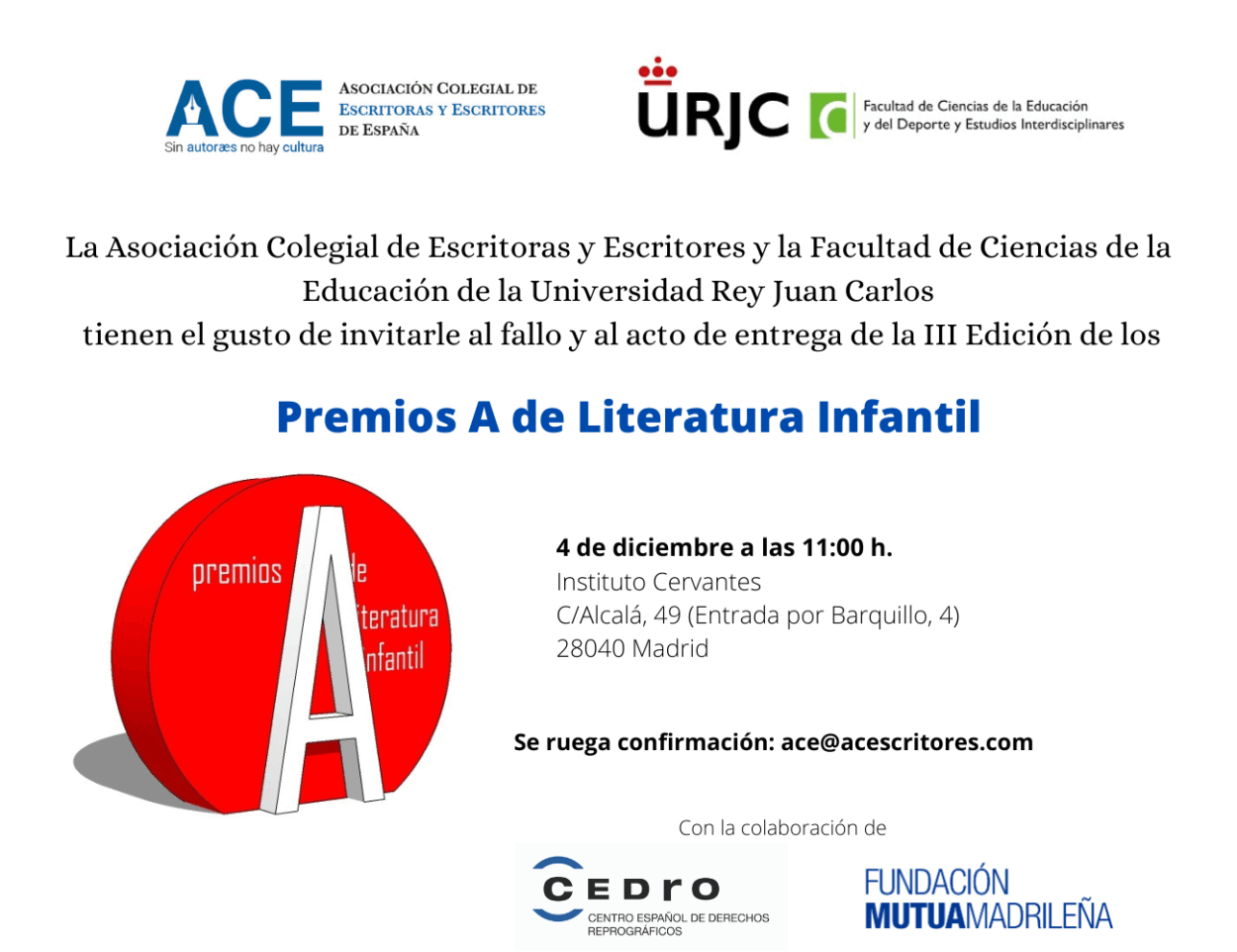 La Asociación Colegial de Escritoras y Escritores (ACE), en colaboración con la Facultad de Ciencias de la Educación de la Universidad Rey Juan Carlos, y con el apoyo de CEDRO y la Fundación Mutua Madrileña, celebrará el acto de entrega y fallo de la III Edición de los Premios A de Literatura Infantil el próximo jueves, 4 de diciembre, a las 11:00 horas, en el Salón de Actos del Instituto Cervantes (entrada por la calle Barquillo, 4, Madrid).