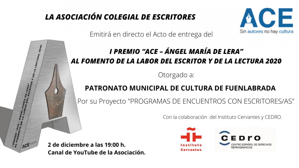 Me complace informaros de la celebración, el próximo miércoles, 2 de diciembre, a las 19:00 horas, del acto de entrega del I PREMIO ÁNGEL MARÍA DE LERA AL FOMENTO DE LA LABOR DEL ESCRITOR Y DE LA LECTURA 2020 otorgado al PATRONATO MUNICIPAL DE CULTURA DE FUENLABRADA por su proyecto «PROGRAMAS DE ENCUENTROS CON ESCRITORES/AS» y por su sostenida actividad, durante 34 años, de apoyo a los escritores y de fomento de la lectura en públicos de todas las edades.
