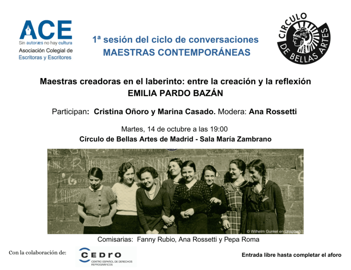 Coincidiendo con el centenario del edificio del Círculo de Bellas Artes, la Asociación Colegial de Escritoras y Escritores de España (ACE) y el Círculo de Bellas Artes, con el apoyo de CEDRO, organizan el ciclo de conversaciones Maestras contemporáneas, que tendrá lugar de octubre de 2025 a marzo de 2026.