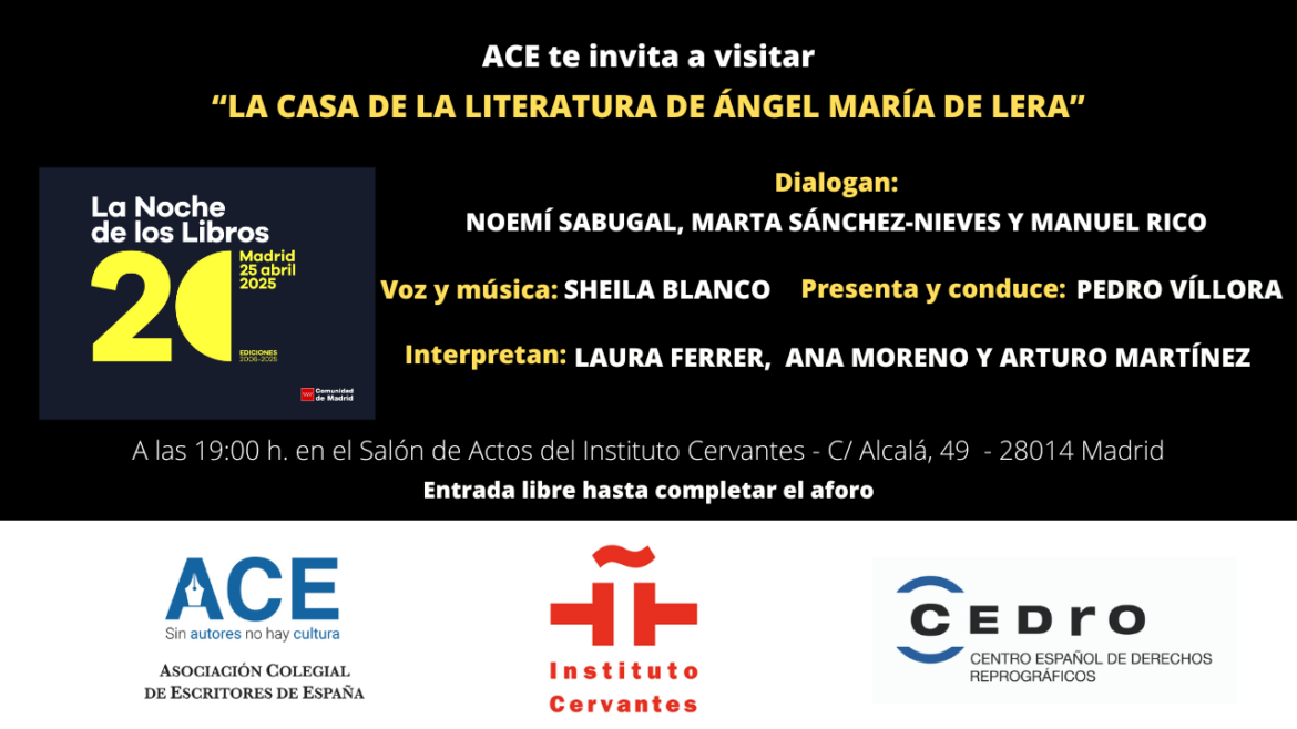 Con motivo de la celebración de La Noche de los Libros el próximo viernes 25 de abril de 2025, la Asociación Colegial de Escritores de España (ACE) con la colaboración de CEDRO, rendirá homenaje a Ángel María de Lera, figura clave de la literatura española del siglo XX y fundador de la propia ACE.
