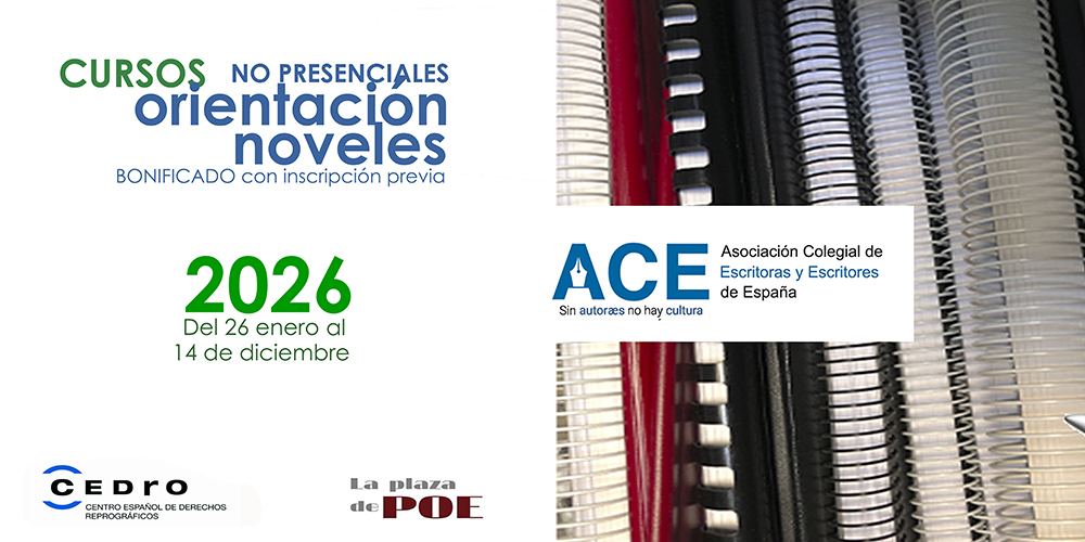 Comienza VI CURSO DE ORIENTACIÓN para ESCRITORES NOVELES 2026 patrocinado por ACE y CEDRO. Es un curso anual implementado por La plaza de Poe, de orientación creativa, editorial y legal, para aquellos escritores y escritoras que comienzan su andadura literaria. Desde hace años venimos acompañando a los autores en el recorrido detallado, y muy completo, por todos aquellos aspectos que cualquier escritor novel debería conocer.