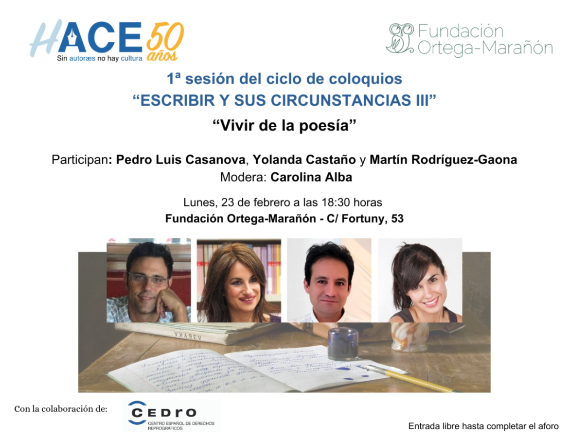 El próximo lunes 23 de febrero, a las 18:30 horas, la Asociación Colegial de Escritores y Escritoras de España (ACE) inaugura la tercera edición del ciclo “Escribir y sus circunstancias”, que en este primer semestre de 2026 se celebrará en la Fundación Ortega-Marañón (calle Fortuny, 53, 28010, Madrid), debido a las obras de reforma en la Biblioteca Nacional de España.